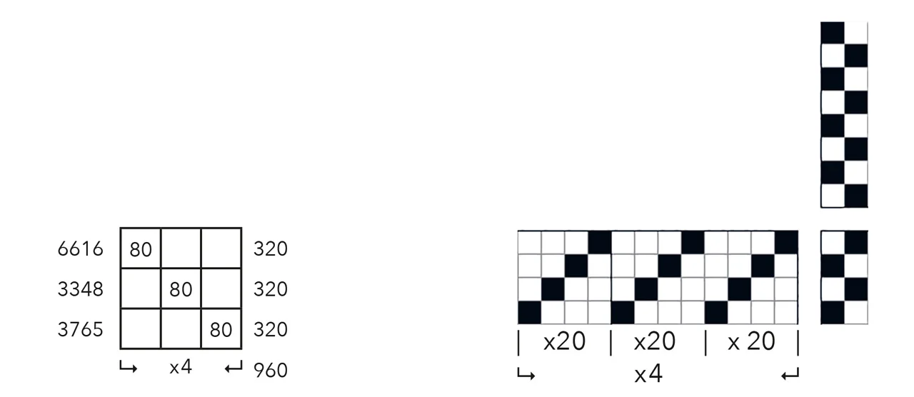 Veving: 1. parti veves x 3 og veksles med 2. parti som veves x 3 til en kvadratisk pute.